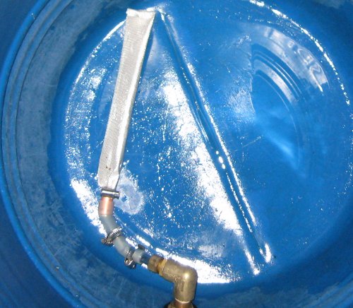 Avtappningen gör jag med en vinkel där en kort bit 15 mm kopparrör sitter och sen en siliconslang där jag satt på en slangnippel för att säkerställa att den håller sig på bottnen. Trär sedan på en rostfri strumpa för att förhindra att humlekottar följer med ut. Strumpan tillverkade jag genom att plocka ut det rostfria nätet från en vanlig hushållssil och sen rulla ihop det.