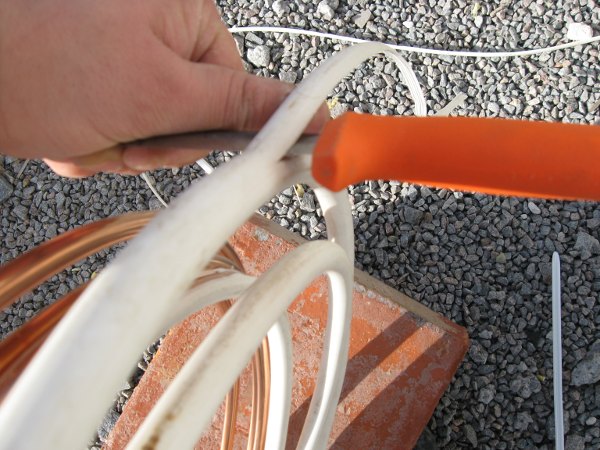 För att tillverka värmeväxlarspiralen så använde jag mig av 10 mm prisolrör (12mm eller 15 mm fungerar också bra men man får tänka på att ju större yta man har i spiralen desto mer värmeväxling får man - vilket kan vara bra men också oönskat). Jag använde mig av ca 10 meter prisolrör och har bra resultat.