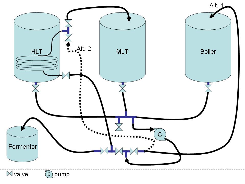 Alt 1: Transport från mäskningstunna till vörtkokare Alt 2: Transport av varm vört upp till värmeväxlarslingan (som i detta fall används som kylare)
